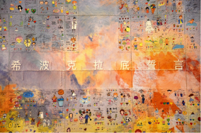 《用生命書寫的希波克拉底誓言》壁畫高9.9米,寬6.57米,畫面層用了非常復(fù)雜的轉(zhuǎn)印技術(shù),把醫(yī)護(hù)人員們的手記還原到了凹凸不平的機(jī)理上。壁畫的基底,則使用了20000米特制麻繩,根據(jù)醫(yī)護(hù)人員手記的圖案粘合形成底圖機(jī)理。