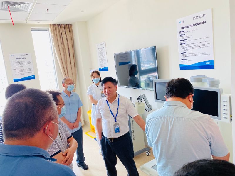 隨后,羅成剛主任在腫瘤科戈偉主任和醫(yī)務科周志斌主任的陪同下,帶領評審團成員陳剛主任(華中科技大學附屬同濟醫(yī)院)、魯力主任(湖北省腫瘤醫(yī)院)、孫建海主任(湖北省中山醫(yī)院)一起,參觀腫瘤科腹腔熱灌注操作室,詳細了解腹腔熱灌注機的類型、配置及操作流程。他們對治療室及腫瘤科良好的就醫(yī)治療環(huán)境給予了高度的贊揚,對腹腔熱灌注的規(guī)范使用給予了肯定。